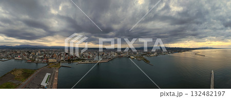 夕暮れの青森市と青森港の眺め(180度パノラマ)青森県青森市(ドローンによる空撮)
