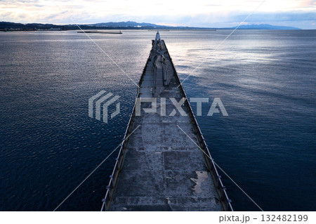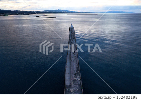 夕暮れの青森港北防波堤と灯台 青森港と津軽半島 青森県青森市(ドローンによる空撮)