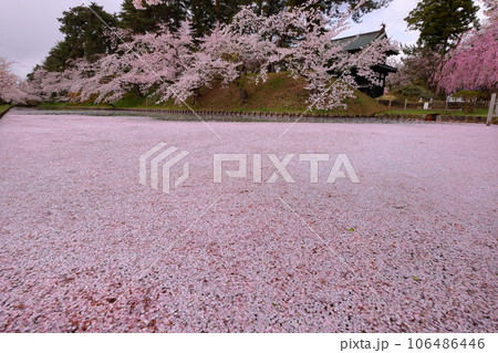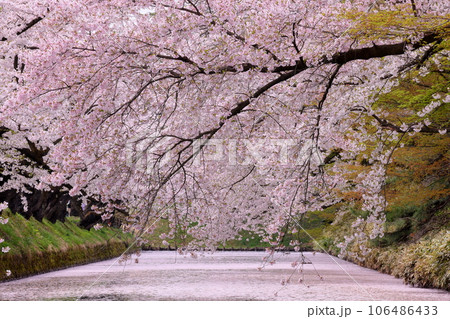 青森県弘前市下白銀町弘前公園 弘前城外濠さくらの花筏とソメイヨシノ