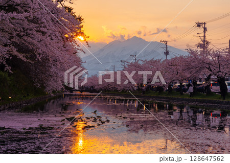 青森県弘前市下白銀町弘前公園 花筏が浮かぶ弘前城外濠の満開のソメイヨシノ桜並木と岩木山夕景