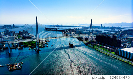 白い夢舞大橋越しに大阪港と赤い港大橋が見える風景 大阪市此花区