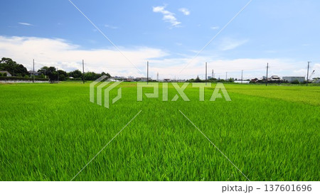風に吹かれる郊外の夏の田んぼ風景