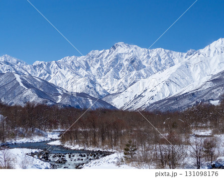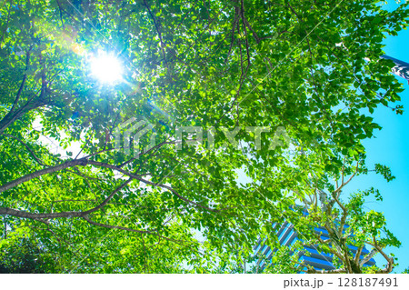 綺麗な青空と新緑の背景素材 都会の猛暑日 背景イメージ バックグラウンド