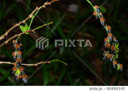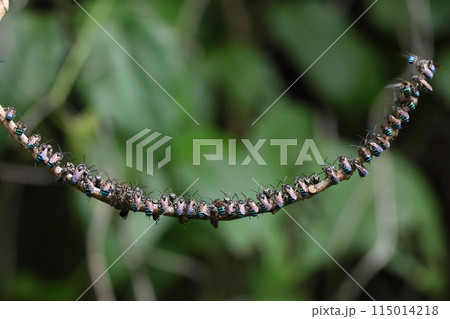 生き物 昆虫 アオスジフトハナバチ、石垣島名物?夜、細いつるなどに集団でぶら下がってお休み中