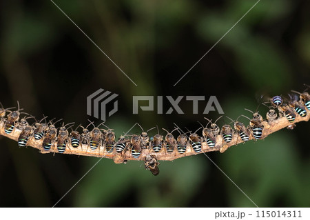 生き物 昆虫 アオスジフトハナバチ、六月の石垣島の夜。十頭以上の集団でお休み中