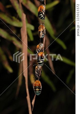 夜集団で蔦につかまって眠るアオスジコシブトハナバチ 青筋腰太花蜂