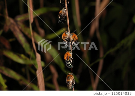 夜に集団で休息するアオスジコシブトハナバチ 青筋腰太花蜂