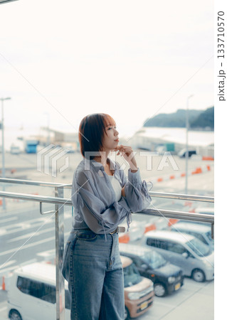 デニムスタイルのシニア女性が海を眺めるポートレート