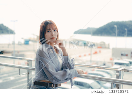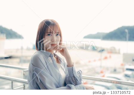 海辺で微笑む20代女性のポートレート