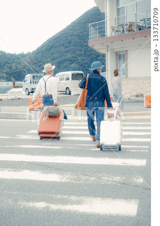 スーツケースを引いて港を歩く3人の後ろ姿