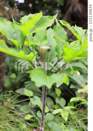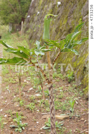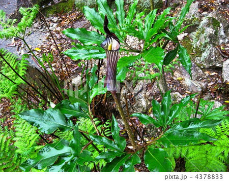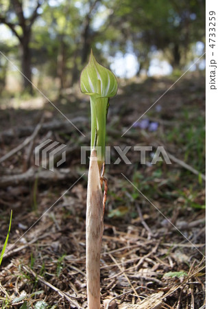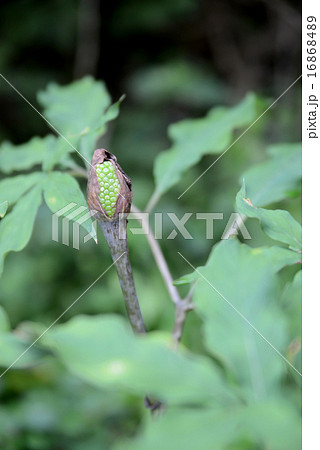 自然 植物 マムシグサ、アオマムシグサ。初夏の林の中で緑色の仏炎苞が鎌首をもたげます
