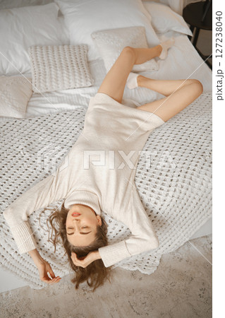 Woman relaxing on bed wearing a cozy sweater in a softly lit room with neutral colors