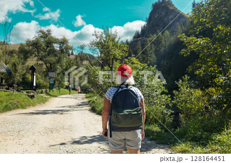 Senior Woman Hiking Alone on Mountain Trail in Nature
