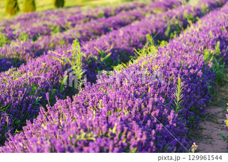 Rows of vibrant blooming purple lavender flower in field in full summer light stretching to horizon