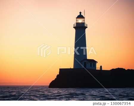 A majestic lighthouse beaming its guiding light over a tranquil sea during a calm evening