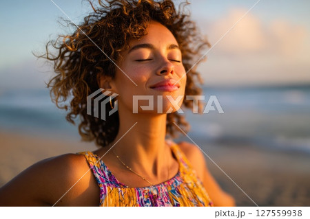 Her relaxed posture and tranquil expression suggest a state of calm and contentment.