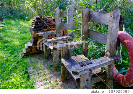 An old wooden chair in the garden for a quiet, relaxing view of nature outside. Overgrown space between plants. A peaceful recreation area in a green environment. Next to the lifebuoy.