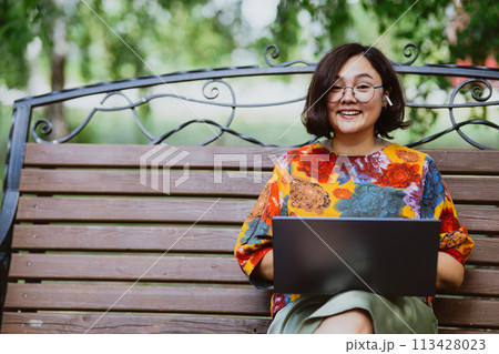 Female professional enjoys remote work on a calm sunny day in a lush green park An Asian businesswoman smiling while successfully completing tasks on laptop on bench outdoors