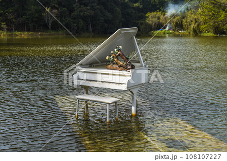 White old rusty piano inside the lake against the pine forest in Da Lat