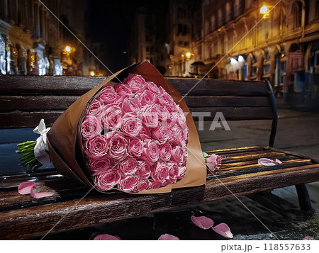 夜の街に咲く愛、ベンチに置かれた薔薇の贈り物
