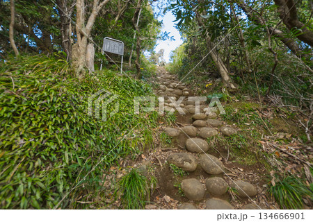 為朝神社石宮へ続く石段の参道 八丈島の森に囲まれた神聖な道