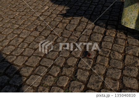 Red admiral Butterfly resting on cobblestone pavement in sunlight