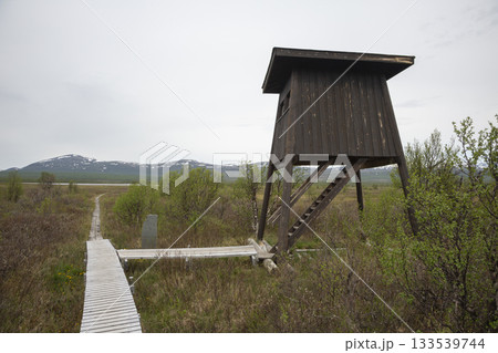 Explore Fokstumyra Nature Reserve in Dovrefjell mountains with its birdwatching tower and surrounding wildlife-rich landscape