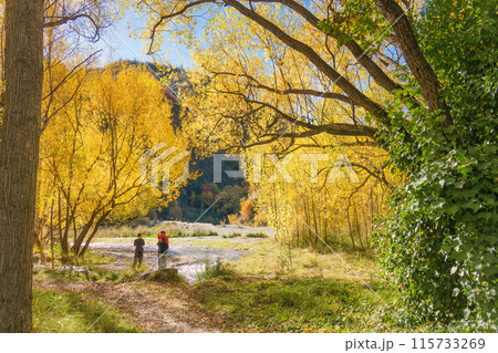 View of autumn forest with yellow leaves and tourist enjoying by the river at Arrowtown
