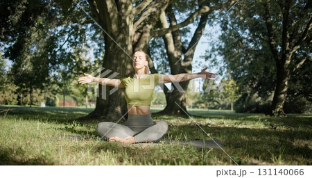 young beautiful white girl doing yoga in park among trees in clearing on summer day