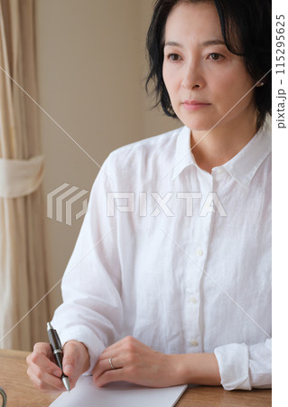 リビングで家族への手紙を書くミドル女性