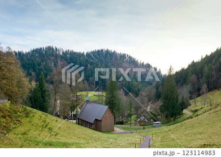 Idyllic German Countryside: Charming Brick Chapel Nestled in Lush Black Forest Valley. Picturesque Rural Landscape with Traditional Houses and Verdant Hills in Scenic Southern Germany
