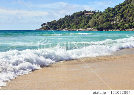 Pristine beach with gentle waves and lush green hills under a bright blue sky
