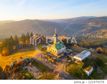 The Tanvaldsky Spicak Lookout Tower stands majestically in the Jizera Mountains during a picturesque autumn evening, surrounded by vibrant foliage and panoramic mountain views.