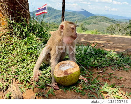 A wild monkey sits on the ground with a coconut in tropical mountains. Wildlife and travel concept.