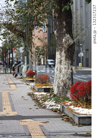 初冬の札幌、初雪と色づいた葉が彩る静かな街角