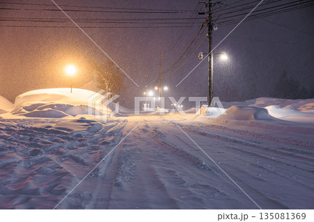 雪道に残るタイヤの跡 深夜の雪道に灯るやさしい街灯