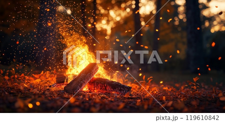 Warm evening campfire surrounded by autumn foliage and glowing embers in a forest