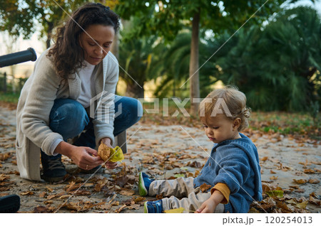 Mother and child enjoying autumn leaves in a park setting