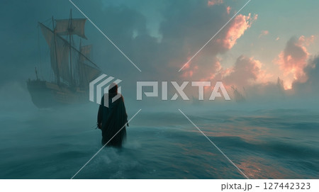 Jesus walks on water at sunrise as disciples witness the miraculous moment from their boat