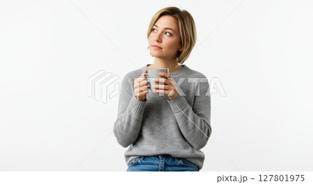 Serene Woman Enjoying Cup of Tea at Sunrise in Soft Natural Light with a Peaceful Expression