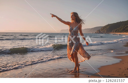 Woman is walking on the beach pointing to the ocean. The beach is calm and peaceful, and the woman is enjoying the moment