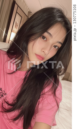 Female in pink t-shirt poses casually in a cozy hotel room during evening hours with soft lighting