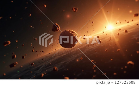 In a breathtaking cosmic view, asteroids float effortlessly amidst the stars, while a brilliant sunset casts golden hues across the scene, evoking wonder and serenity Generative AI