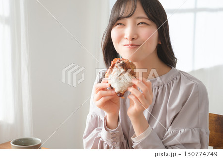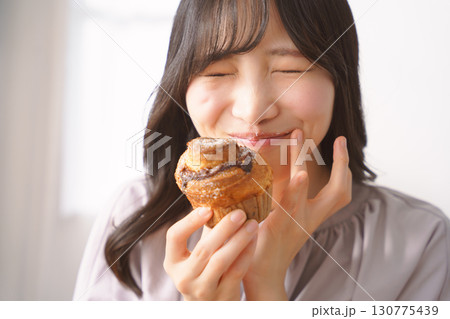 美味しそうにマフィンを食べる若い女性