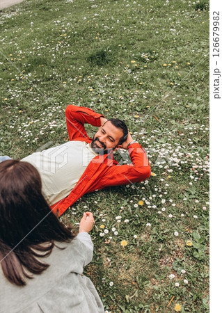 Two people,woman and man relaxing together on grassy field with small white wildflowers in summer, enjoying peaceful moment outdoors.Casual clothing and natural surroundings create a calm, authentic,