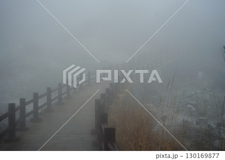 霧に包まれた雲仙温泉・地獄めぐりの遊歩道