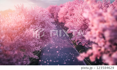 桜並木と舞い散る花びらの幻想的な小道