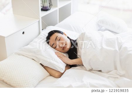 Asian woman enjoying peaceful sleep in white bed, showcasing relaxation and comfort. Serene morning atmosphere conveys sense of tranquility and rest. Ideal concept for sleep, rest, and wellness themes