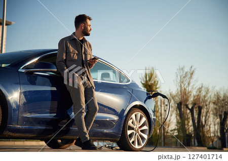 Standing and waiting for his automobile to charge. Man is near his electric car outdoors