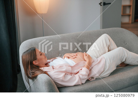 Resting on the sofa. Beautiful pregnant woman is indoors at home